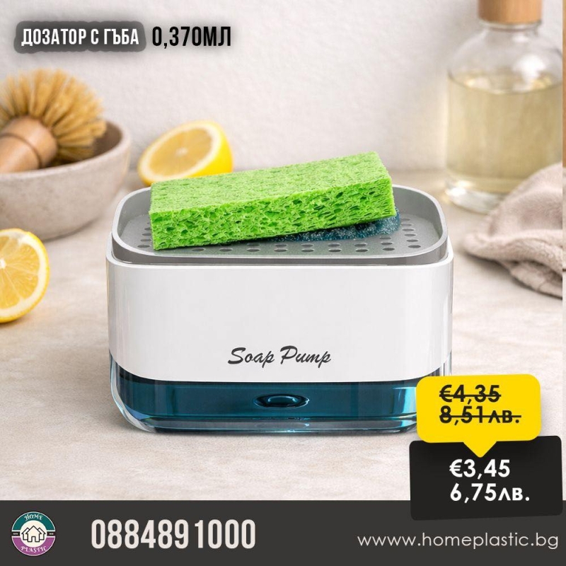 Дозатор с гъба се състои от контейнер,помпичка и поставка за гъба