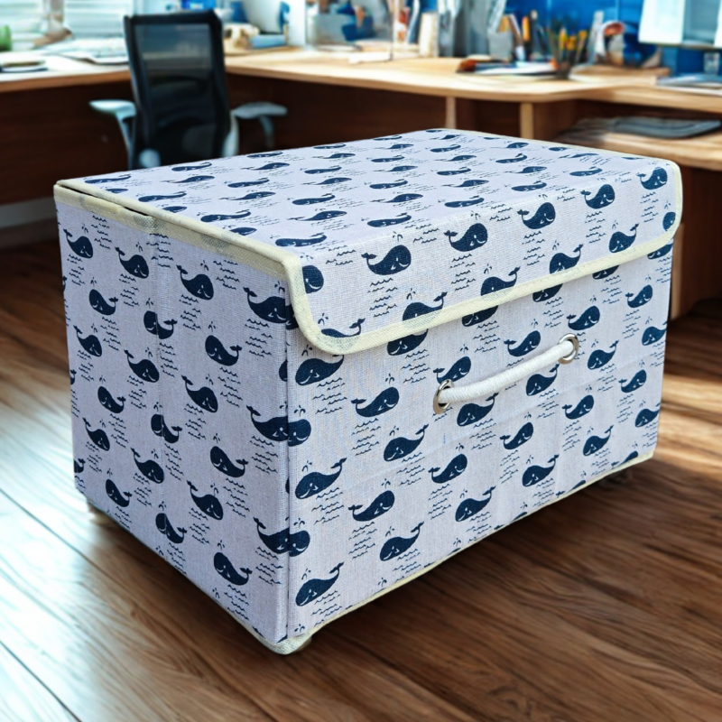Сгъваема кутия за съхранение на дрехи и аксесоари. Кутията е изработена от текстил и картон.